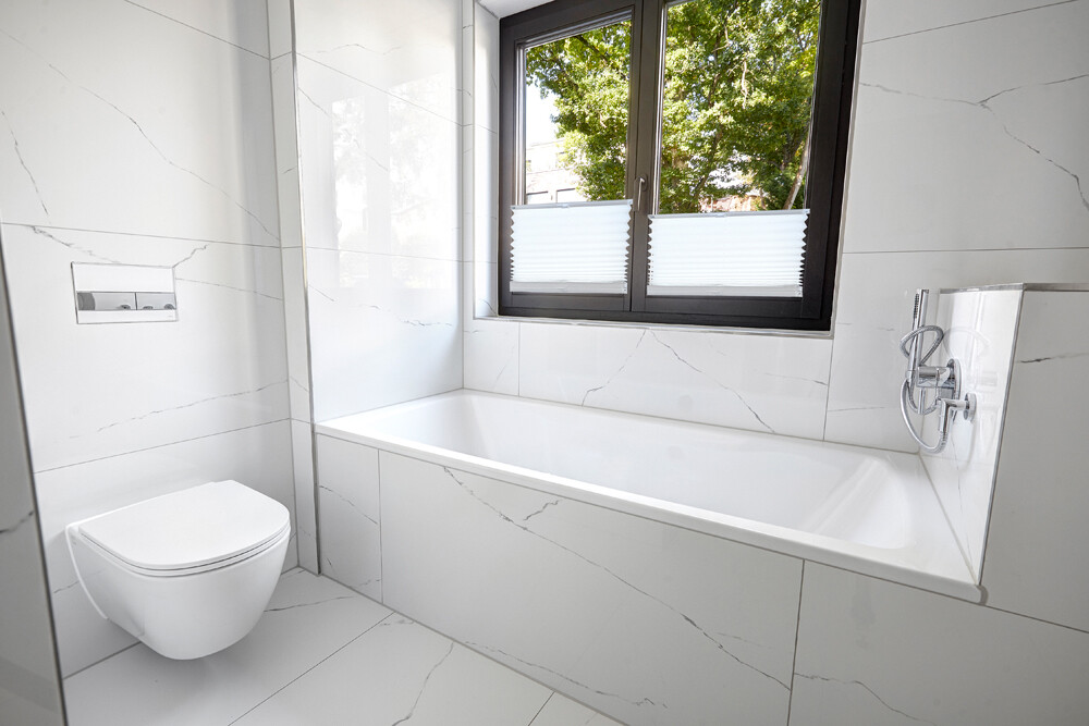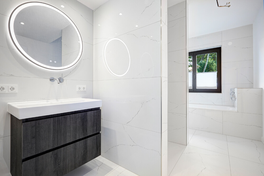 - Bäder in weißem Marmor, Armaturen von Dornbracht, beheizte Spiegel